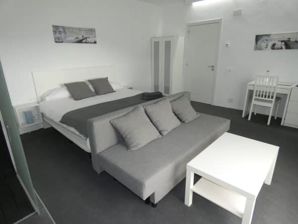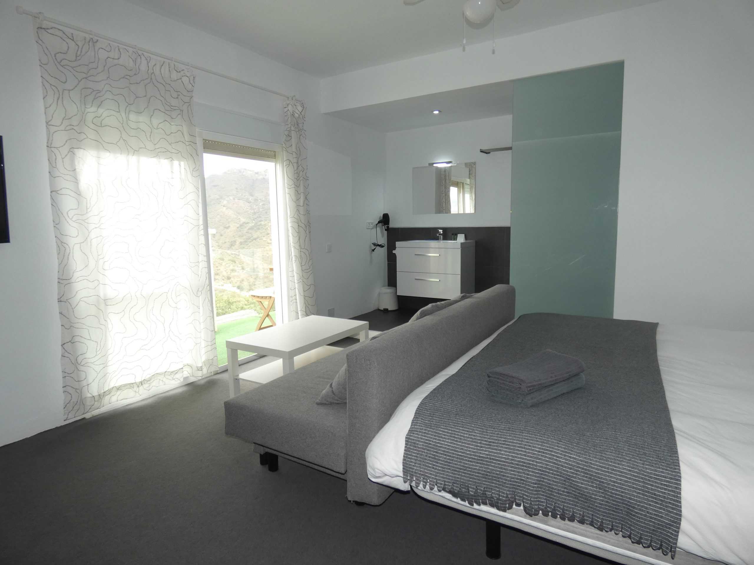 The double deluxe room benefits from a large bedroom with en-suite shower room and a private balcony. Stairs from the balcony lead up to a private roof terrace boasting incredible 360º views over the surrounding mountains and countryside.