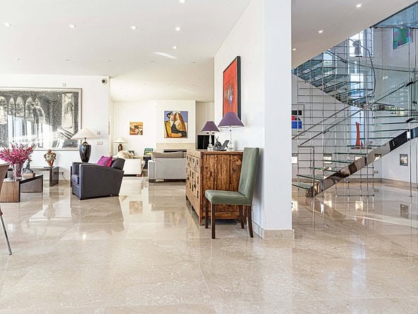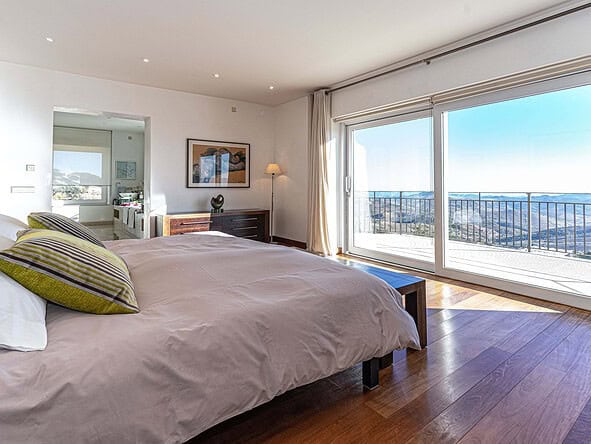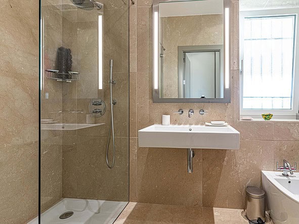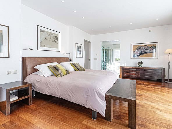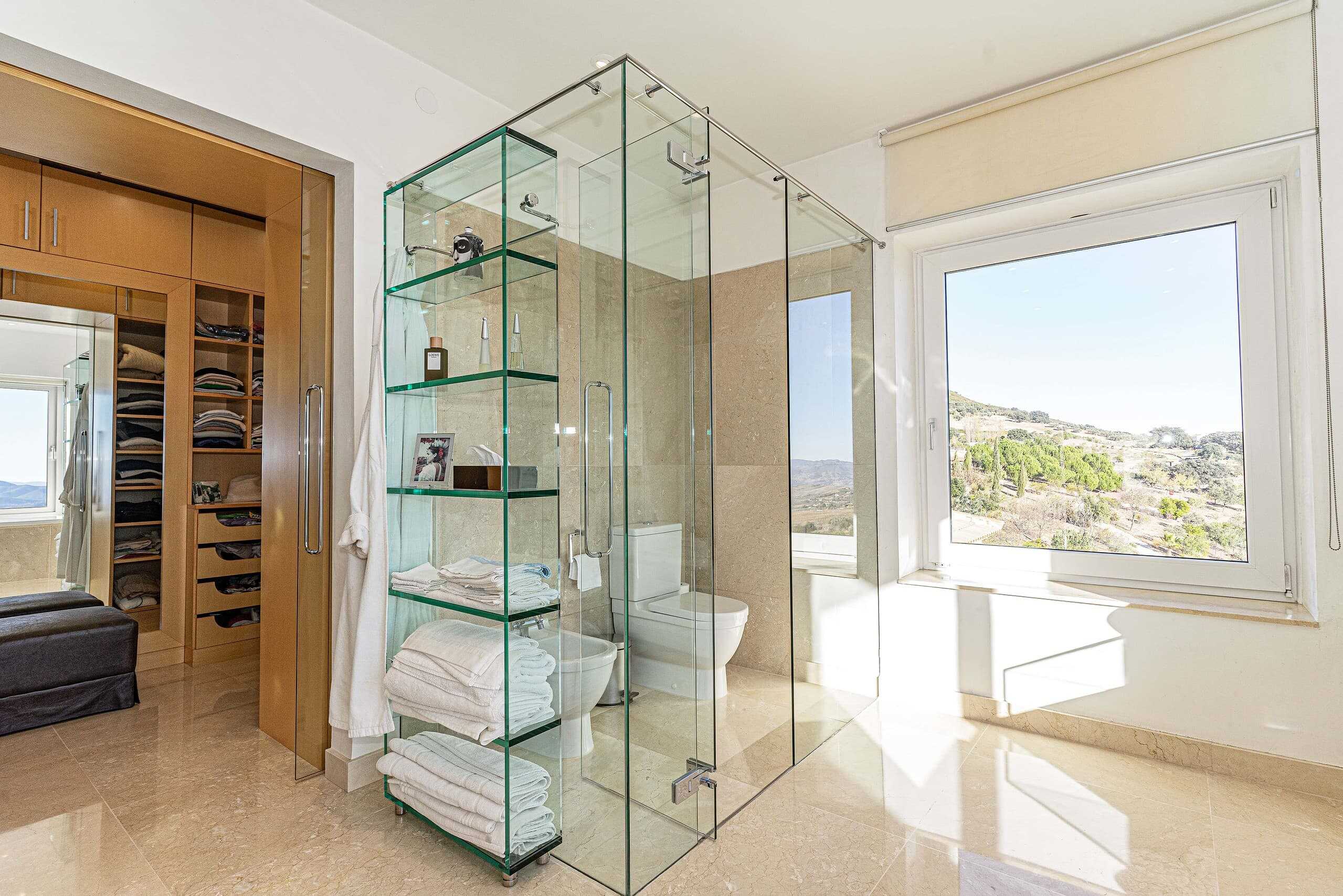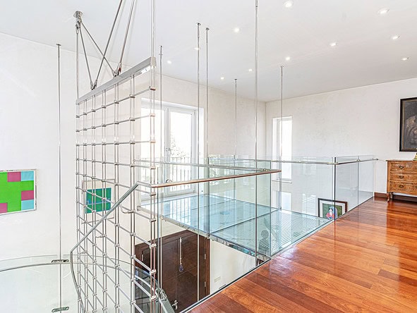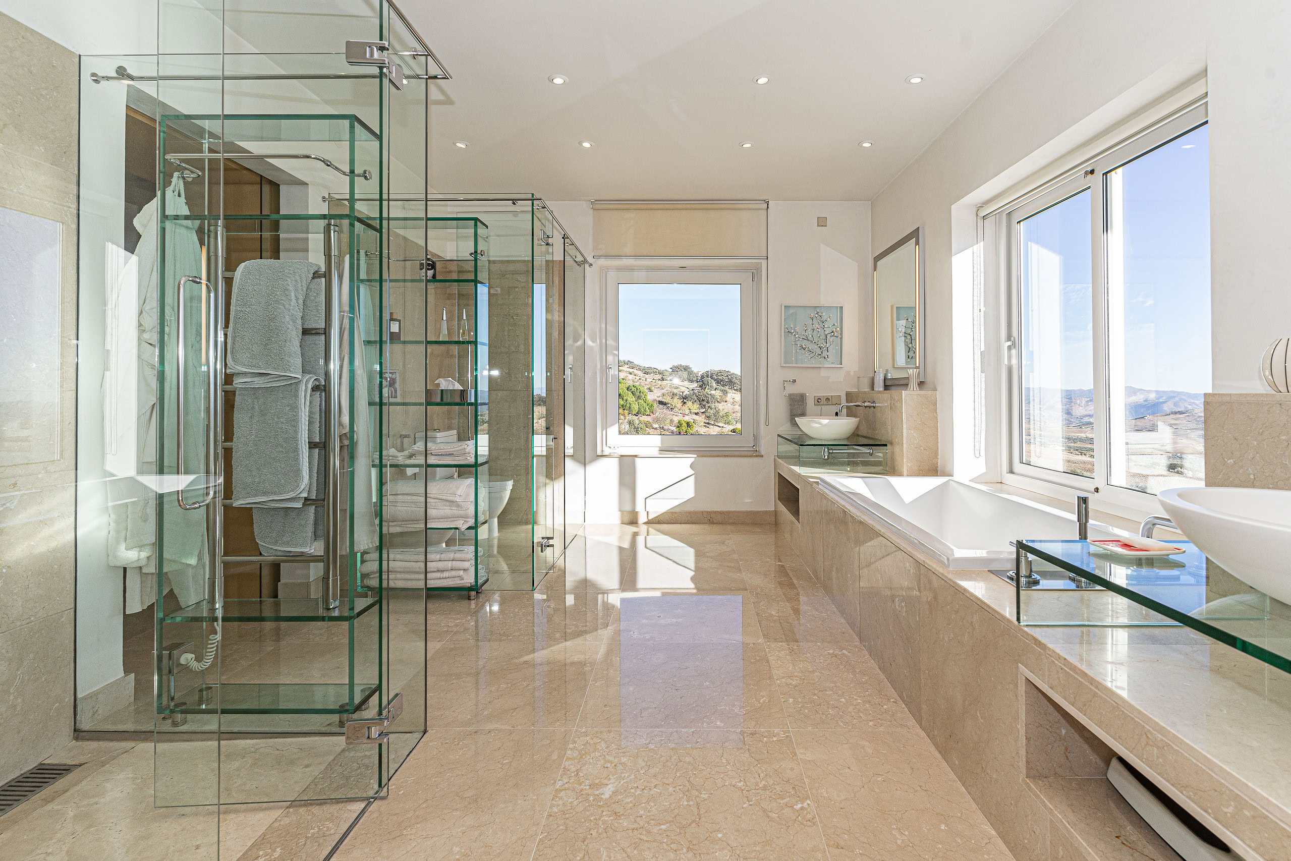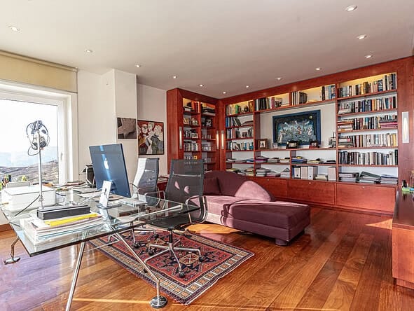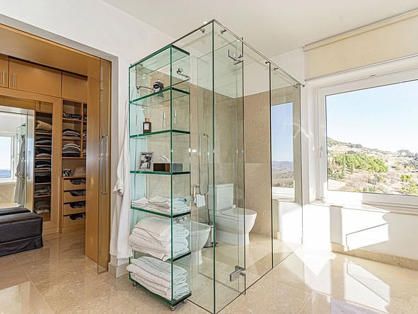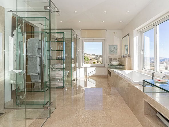 A glass-floored landing leads to an incredible master suite measuring 120m2 and boasting large double-glazed windows and direct access to a private terrace with incredible views. To the left is a large office / library / lounge area whilst to the right is a walk-in wardrobe / dressing room plus a large, modern fitted bathroom with twin sinks, bathtub, glass-enclosed shower unit and a WC.