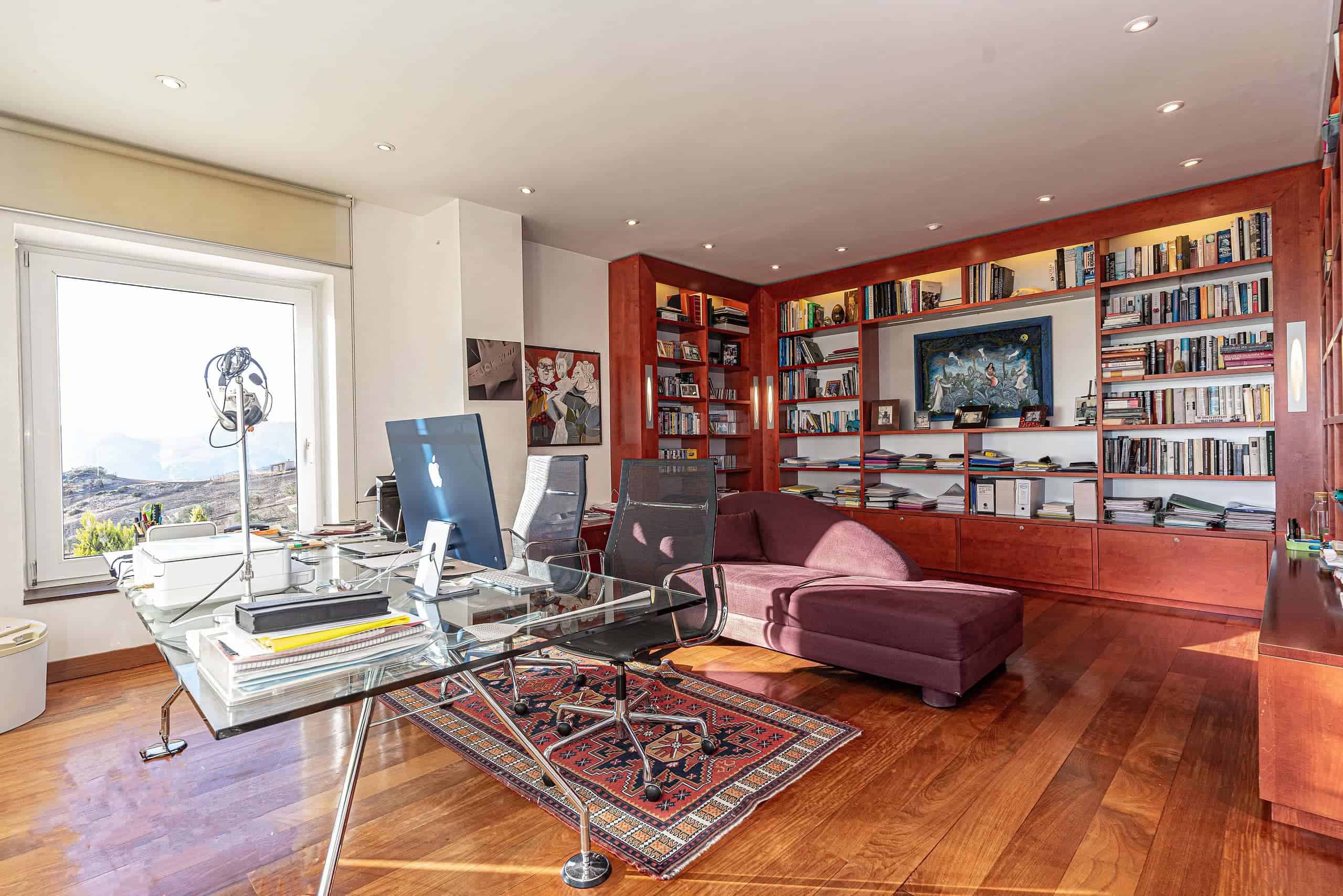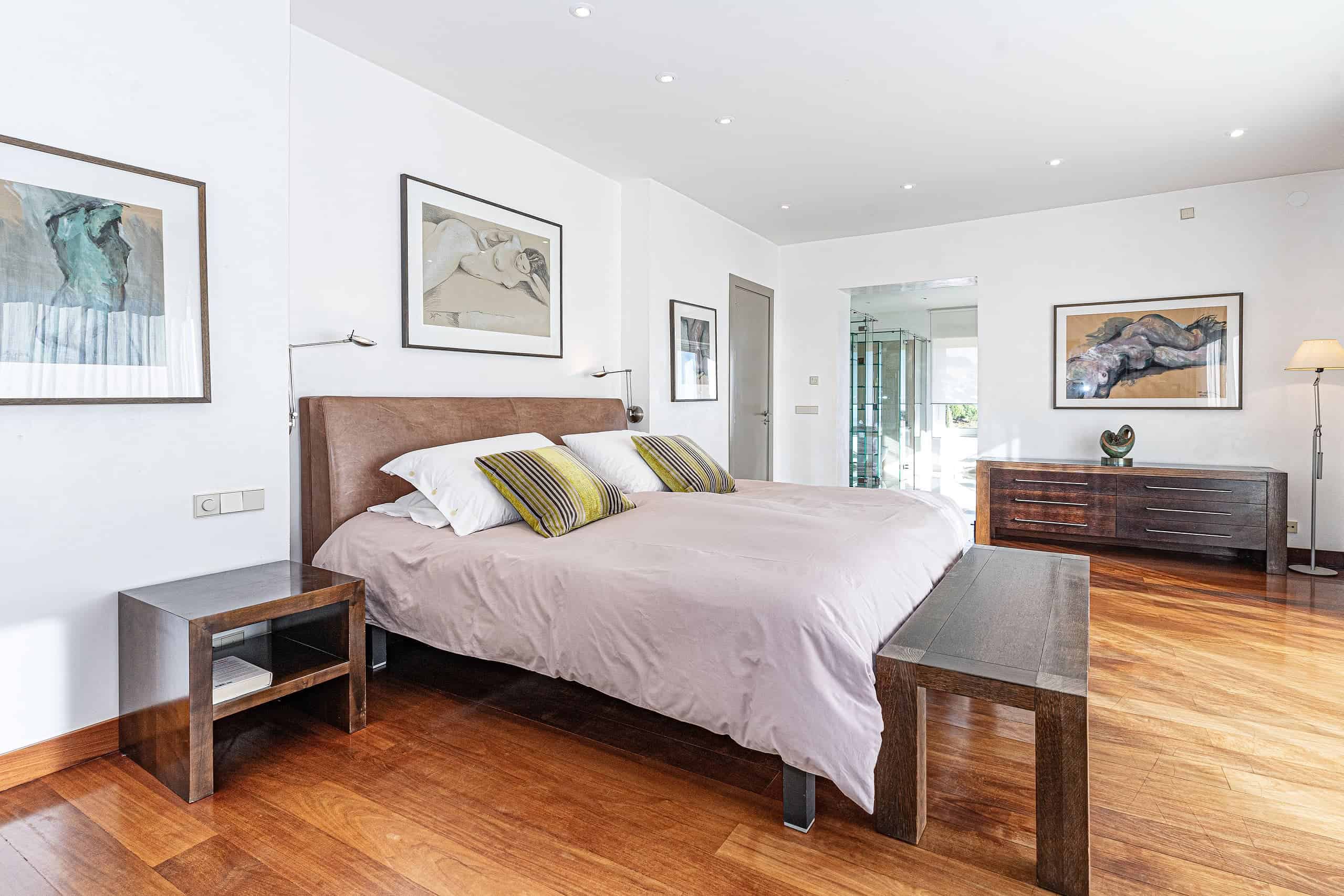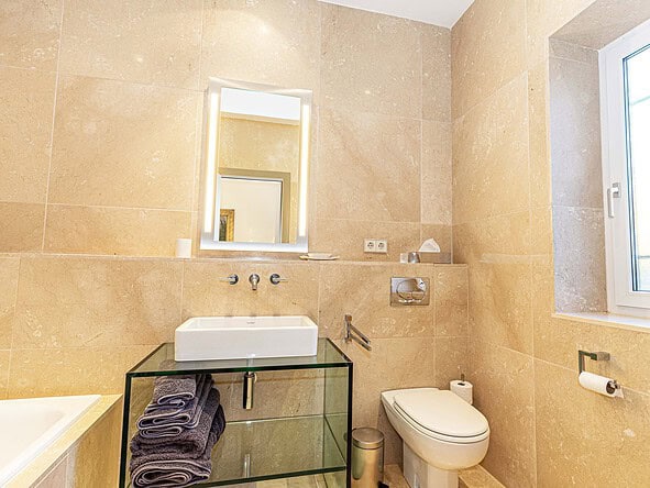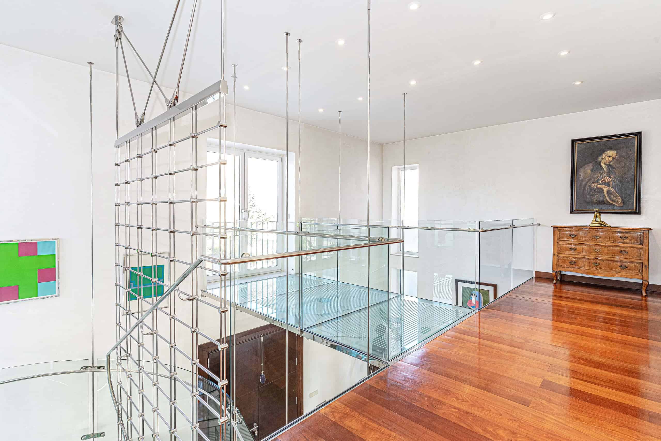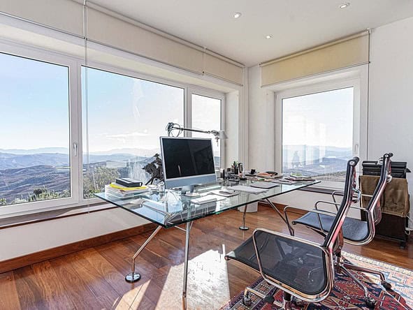 A glass-floored landing leads to an incredible master suite measuring 120m2 and boasting large double-glazed windows and direct access to a private terrace with incredible views. To the left is a large office / library / lounge area whilst to the right is a walk-in wardrobe / dressing room plus a large, modern fitted bathroom with twin sinks, bathtub, glass-enclosed shower unit and a WC.