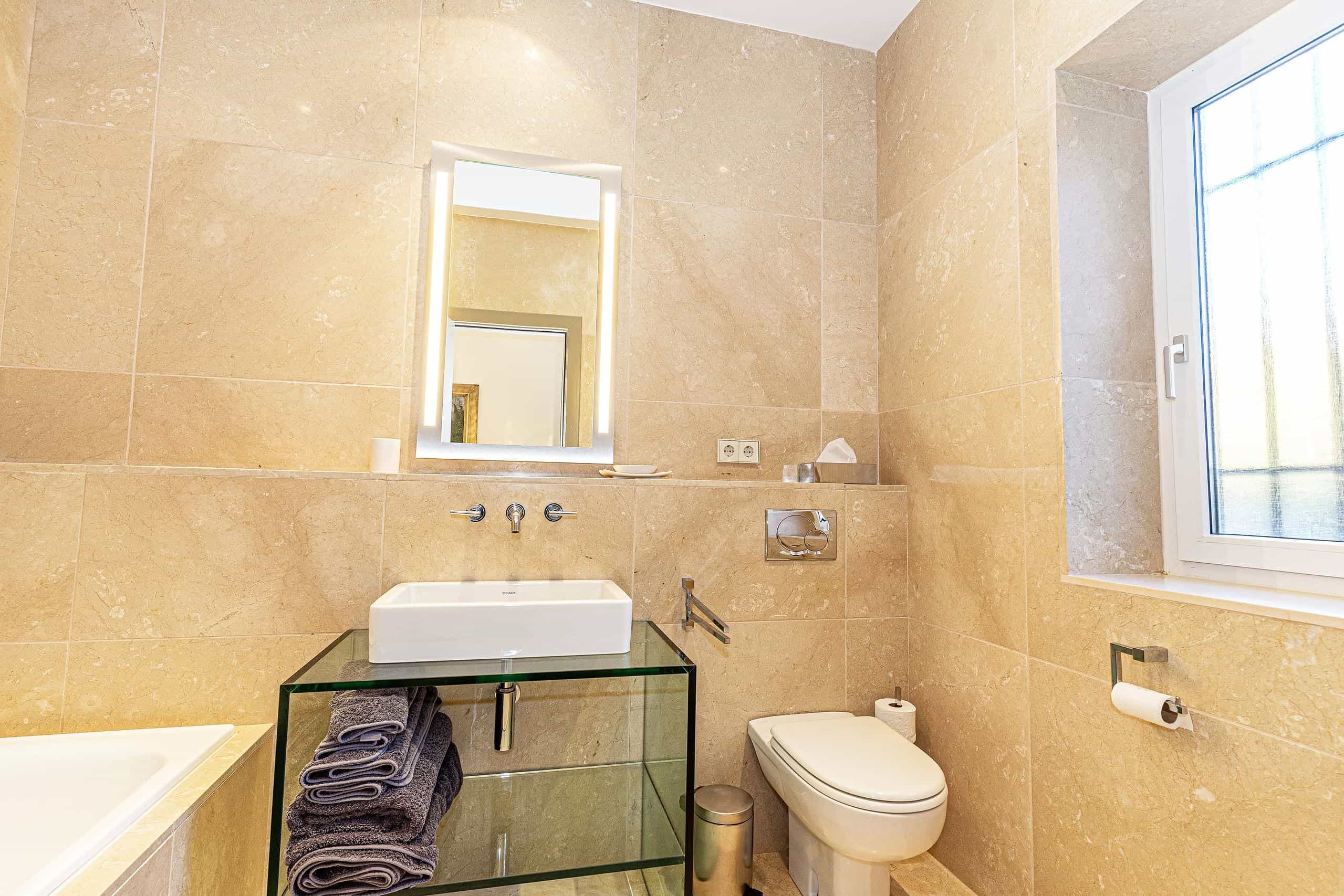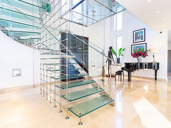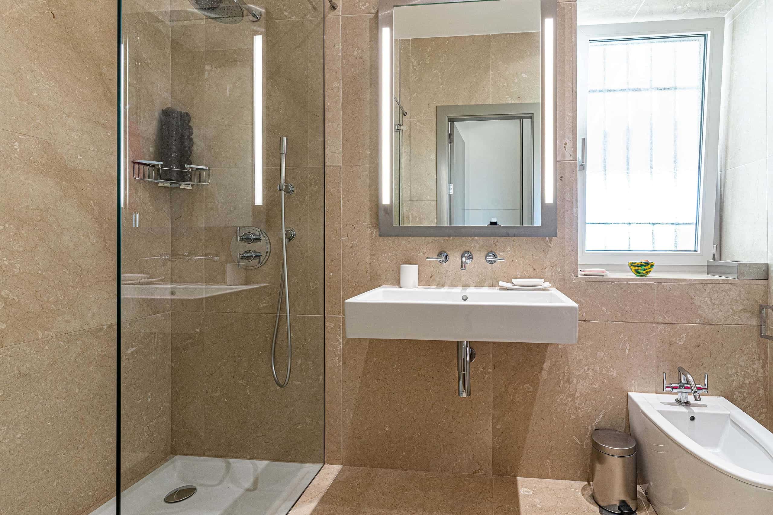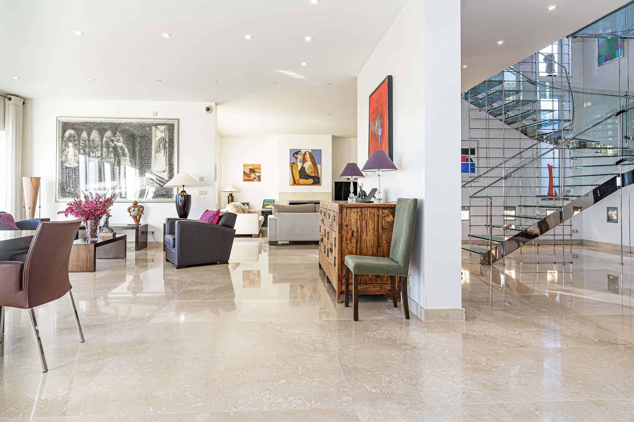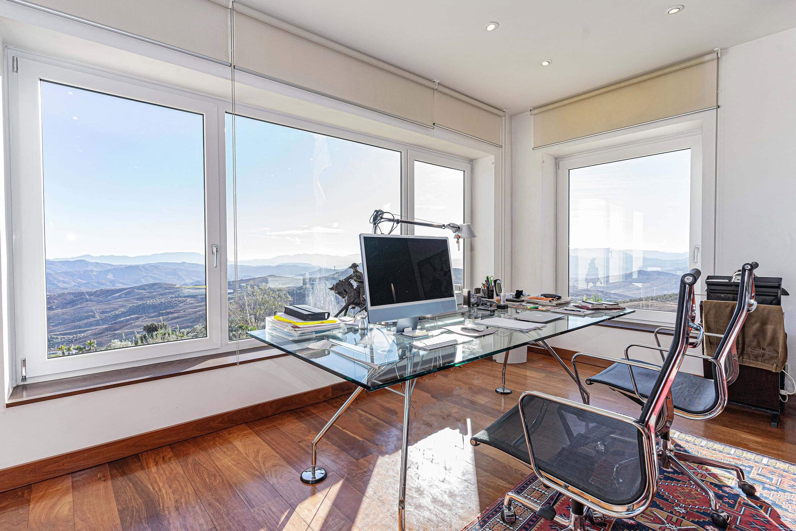 A glass-floored landing leads to an incredible master suite measuring 120m2 and boasting large double-glazed windows and direct access to a private terrace with incredible views. To the left is a large office / library / lounge area whilst to the right is a walk-in wardrobe / dressing room plus a large, modern fitted bathroom with twin sinks, bathtub, glass-enclosed shower unit and a WC.