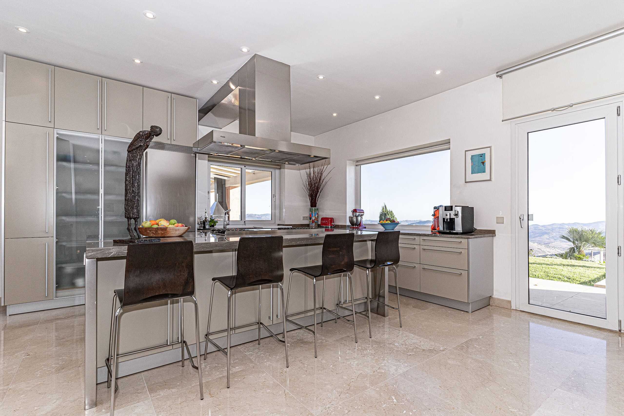 To the left is a spacious “Avant Garde”style kitchen benefitting from a large central island, high quality white goods and built-in appliances including a Wolf sub zero refrigerator and built-in wine cooler for up to 100 bottles.