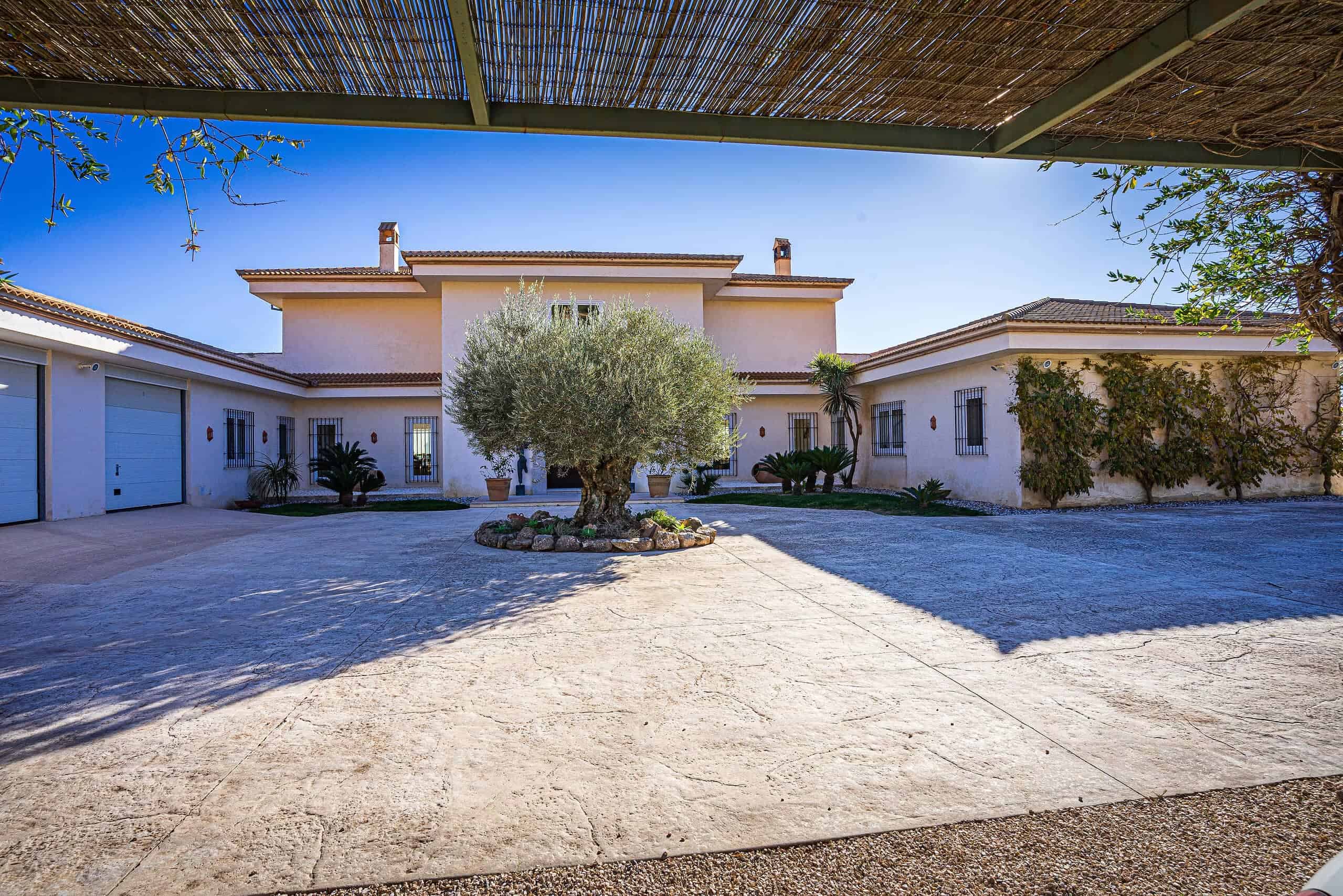 An electric-gated driveway leads to the main house and a spacious parking area for numerous vehicles.